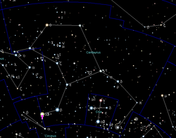 Viewed from near Alpha Centauri, the sky (other than the Alpha Centauri stars) would appear very much as it does to observers on Earth, with most of the constellations such as Ursa Major and Orion being almost unchanged. However, Centaurus would be missing its brightest star and our Sun would appear as a 0.5-magnitude star in Cassiopeia. Roughly speaking, the // of Cassiopeia would become a ///, with the Sun at the leftmost end, closest to ε Cassiopeiae. The position can easily be plotted as RA 02h39m35s, dec +60°50', or antipodal to Alpha Centauri's position as seen from Earth.Nearby very bright stars such as Sirius and Procyon would appear to be in very different positions, as would Altair to a lesser extent. Sirius would become part of the constellation of Orion, appearing 2 degrees to the west of Betelgeuse, slightly dimmer than from here (-1.2). The stars Fomalhaut and Vega, although further away, would appear somewhat displaced as well. Proxima Centauri would be an inconspicuous 4.5 magnitude star, which considering it would only be a quarter of a light-year away shows just how dim Proxima really is.A hypothetical planet around either α Centauri A or B would see the other star as a very bright secondary. For example, an Earth-like planet at 1.25 Astronomical Units from α Cen A (with a revolution period of 1.34 a) would get Sun-like illumination from its primary, and α Cen B would appear 5.7 to 8.6 magnitudes dimmer (−21.0 to −18.2), 190 to 2700 times dimmer than α Cen A but still 29 to 9 times brighter than the full Moon. Conversely, an Earth-like planet at 0.71 AUs from α Cen B (with a revolution period of 0.63 a) would get Sun-like illumination from its primary, and α Cen A would appear 4.6 to 7.3 magnitudes dimmer (−22.1 to −19.4), 70 to 840 times dimmer than α Cen B but still 45 to 15 times brighter than the full Moon. In both cases the secondary sun would, in the course of the planet's year, appear to circle the sky. It would start off right beside the primary and end up, half a period later, opposite it in the sky (a "midnight sun"). After another half period, it would complete the cycle. For a hypothetical Earthlike planet around either star, the secondary sun would not be bright enough to adversely affect climate or plant photosynthesis (being as far away as Saturn is from our Sun), but would mean that for about half the year, the night sky, instead of a pitch black would appear a dark blue, and one could walk around rather easily without artificial light.