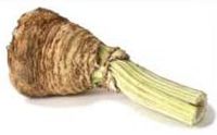 Celeriac (Apium graveolens Rapaceum Group) (also known as 'turnip-rooted celery' or 'knob celery'), is a specially selected Cultivar Group of celery, grown as a root vegetable for its large and well-developed taproot rather than for its stem and leaves. The root is used when it is about 10-12 cm diameter, or the size of a large potato. Celeriac may be used raw or fresh. It is best to peel celeriac before use, since the outer skin is tough and stringy. It has the celery flavor, so it is often used as a flavoring in soups and stews; it can also be mashed or used in casseroles and baked dishes. The hollow stalk of the upper plant can be cut into drinking straw lengths, rinsed out, and used for tomato drinks such as the Bloody Mary. The tomato juice moving through the stalk is lightly permeated with the celery flavor.It is not as popular as it might be, especially in the western hemisphere, very possibly owing to its garish appearance before cleaning: it has been described as "a vegetable octopus", owing to the tangle of unsightly rootlets that grow at the base.There are numerous cultivars available, especially in Europe, where root vegetables are popular. Among the types are 'Prinz', 'Diamant', 'Ibis', and 'Kojak', which all received Royal Horticultural Society Award of Garden Merit designation in the year 2000 trials.Celeriac has good keeping properties, and should last 3 to 4 months if stored between 0° and 5 °C and not allowed to dry out. |