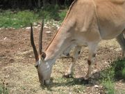 The Common Eland (Taurotragus oryx) is a savannah and plain antelope found in East and Southern Africa.The Common Eland stands around two metres at the shoulder and weighs 300 kilograms to a tonne. Common Eland females have a tan coat while the males' coat is a darker tan with a blue tinge to it, there may be a single white stripe vertically placed on the sides. The males have dense fur on their foreheads and a large dewlap. Both sexes have horns, which are about 65 centimetres long and almost straight. The horns of the female are longer but thinner than those of the male.Common Eland live on the savannah and eat grass, branches and leaves. They are diurnal but tend towards inactivity during the heat of the day. Herds are usually between thirty and eighty individuals but are known to reach upwards of four hundred. The Common Eland has an unusual social life. They come and go, taking advantage of herd life when they need to without forming close ties.They "are very agile and can easily jump a 1.5m fence from a standing start" (sign from Western Plains Zoo, Dubbo, NSW, Australia).Common Eland are sometimes considered part of the genus Tragelaphus but it is usually catagorised as Taurotragus with the Giant Eland.
