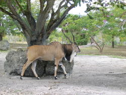 The Giant Eland (Taurotragus derbianus also known as the Derby Eland) is an open forest savannah antelope. It is found in Central African Republic, Sudan and Senegal. There are two subspecies the endangeredT. d. derbianus found in Senegal's Niokolo-Koba National Park, and the low riskT. d. gigas found in Central Africa.Giant Eland stand 150 to 175 centimetre at the shoulder and weigh from five to nine hundred kilograms. The coat is chestnut, darker in males than females. There are around ten white vertical stripes on the body as well as a white underside and black definition around the base of the neck and along the nose. There is a bit of a dewlap under the throat and a short black mane running down the back almost to the back legs. Both sexes have horns which are relatively straight with many twists. Males have larger horns than females, they reach 120 centimetres.Giant Eland live in open forest and savannah where they eat grass, leaves and branches. Giant Eland are mainly nocturnal. Giant Eland form groups of around twenty animals though double that is possible. These herds are nomadic, migrating extensively.The binomial commemorates Edward Smith-Stanley, 13th Earl of Derby.