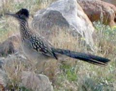 The Greater Roadrunner (Geococcyx californianus) is a large, long-legged member of the Cuckoo family, Cuculidae.Adults have a bushy crest and long thick dark bills. They have a long dark tail, a dark head and back, and are pale on the front of the neck and on the belly. Although capable of flight, they spend most of their time on the ground. They can run at speeds of 15 miles per hour or more. They nest on a platform of sticks in a cactus or bush.These birds walk rapidly about, running down prey or occasionally jumping up to catch insects or birds. They mainly eat insects, reptiles, rodents, tarantulas, scorpions and small birds. Their breeding habitat is desert and shrubby country in the southwestern United States and northern Mexico. The roadrunner is the state bird of New Mexico.This bird was the model for the Warner Bros. Wile E. Coyote and Road Runner cartoons. However, unlike the cartoon, the song of this bird is a dove-like coo.The University of Texas at San Antonio mascot is Rowdy a roadrunner. |