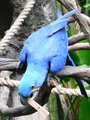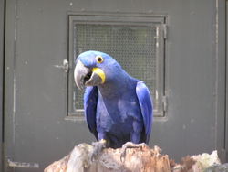 The Hyacinth Macaw (Anodorhynchus hyacinthinus) is the largest species in the macaw family. Its unique size, colour, and markings make the Hyacinth Macaw one of the most popular species of macaw among bird lovers and caretakers. Just like the Green-winged Macaw, the Hyacinth Macaw is considered more docile than other members of the macaw family, making it a popular pet.These birds grow to a total length of 100 cm and weigh 1.4-1.7 kg. The wingspan is 130-150 cm. They have a beak pressure that can easily disassemble the bars of a welded wrought iron cage in a short time. This powerful beak is ideal for its favorite foods, which include hard nuts and seeds that would otherwise be inaccessible. In addition, they eat fruits and other vegetable matter. There are eight species of palm that are central to its diet. They are generally messy eaters.The Hyacinth Macaw has a solid blue/purple body of feathers, similar to the colour of a blueberry. It has a solid black beak with bright yellow along the sides of the lower part of the beak and circling its solid dark eyes. Unlike other breeds of macaw, it does not have a white patch of featherless skin around the eye. The female and male are nearly indistinguishable, although the female is typically a bit more slender.These birds nest in preexisting holes in trees. The clutch size is two or three eggs, although usually only one fledgling survives if food is not plentiful. Juveniles stay with their parents until they are six months old. They are mature and begin breeding at seven years.The Hyacinth Macaw survives today in three known distinct populations in South America: southern Brazil, eastern Bolivia and northeastern Paraguay. It is possible that smaller, fragmented populations occur in other areas of its range. Its habitat includes riverside tropical rain forests and palm swamps.Bird experts often advise those interested in obtaining a macaw as a pet to educate themselves extensively about these birds prior to obtaining one, as these animals require more attention than a dog or cat and they are not considered domesticated animals by the official definition. Also, one should consider the bird's endangered status before choosing to own one, as trade in these birds is illegal.The Hyacinth Macaw is considered an endangered species due to overcollection for the cage bird trade and by the use of their feathers by the Kayapo Indians of Gorotire in southern Brazil. These Indians use the feathers to make headdresses and other baubles for the tourist trade. Also, alike many other animals, their habitat is being reduced by development. Annual grass fires set by gauchos can destroy nest trees.