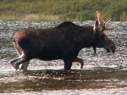 Alces alces, called the moose in North America and the elk in Europe (see also elk for other animals called elk) is a member of the deer family Cervidae, distinguished from other members of Cervidae by the form of the palmate antlers of its males. The word "moose" is from mus or mooz in several of the Algonquian languages, spoken by certain indigenous peoples of the Americas. The name means "twig eater."Moose are typical of boreal and mixed deciduous forests of the Northern Hemisphere in temperate to subarctic climates. In North America, that includes almost all of Canada, Alaska, much of New England, and the upper Rockies. In Europe, most of Sweden, Norway, Finland and Russia have widespread moose populations. In Asia, moose are confined mainly to Russia. Moose were generally more broadly distributed in the past. Many of the European countries to which moose were once native now have extirpated or relic moose populations.Moose have been successfully introduced on the island of Newfoundland in 1904 where they are now the dominant ungulate, and somewhat less successfully on Anticosti Island in the Gulf of St. Lawrence. Ten moose were also introduced in Fiordland, New Zealand in 1910, but they apparently died off. Nevertheless, there have been reported sightings and there is continuing speculation about their existence in New Zealand.